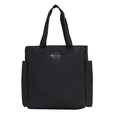 Black Logo Reign Tote Bag. Effortlessly carry your day-to-day essentials in this spacious tote bag crafted with a secure zip closure and organizational pockets. 14 W x 15 H x 6 D100% polyesterZip closureInterior: one mesh and one zip pocketExterior: two slip pocketsSnap wrap handlesImported