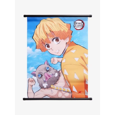 Zenitsu and Inosuke are here to protect your room from demons! With this wall scroll up, you know youll be safe! It features a close up image of the Demon Slayer: Kimetsu no Yaiba duo outside, with the animes title in the corner.