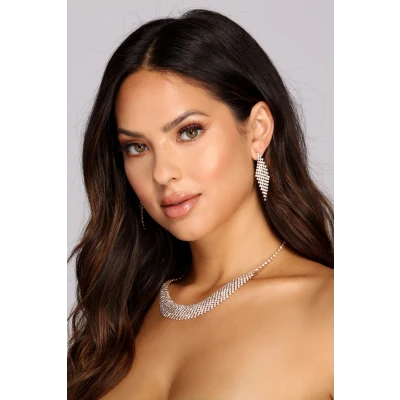 Stylish looks perfect for video calls, virtual meetings, happy hours, e-dates, and remote work from home. A stunning look for all your events including weddings, bridal showers, bridesmaids, bachelorette parties, and engagement shoots. Perfect for High School & College Homecoming 2023, Hoco, Dances, Formals, and Parties. Shower yourself with sparkling rhinestones in this gorgeous necklace and earring set. Shine on like the queen you are with the embellished collar necklace and matching cascading duster earrings. The necklace features an adjustable lobster clasp closure for comfortable wear. Make a statement at your next fancy dinner with this set! Pair with a little black dress and some platform heels and youll be the ultimate glam girl. Fit & Features Set includes rhinestone adorned collar Multi-row design Lobster clasp closure Matching diamond-shaped duster earrings Post back closures Earrings are final sale and may not be returned or exchanged. | Windsor Rhine And Shine Necklace Set in Gold | Rhinestone Free Shipping on All Orders Over $75.