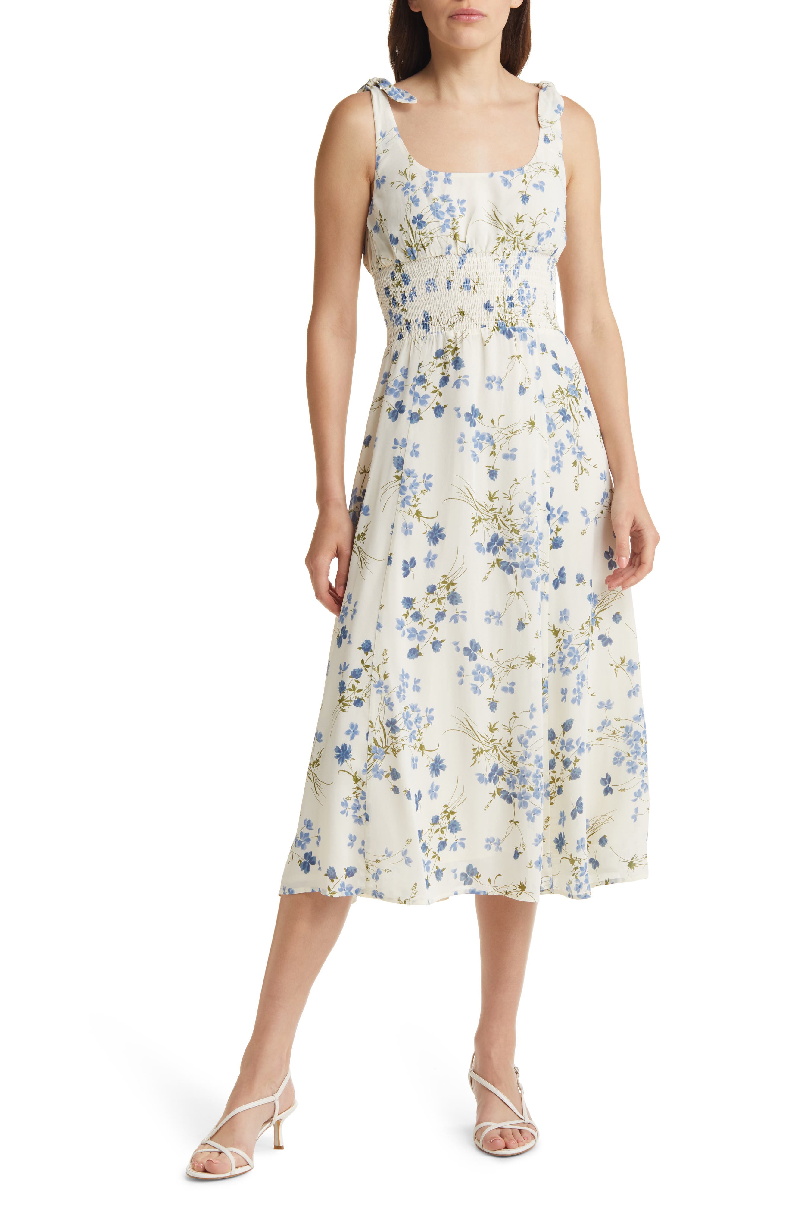 Stretchy smocking cinches the bodice of a dreamy midi dress styled with dainty bows at the shoulders and a romantic floral print perfect for warm weather. 39 center front length (size Medium) Scoop neck Adjustable tie straps Lined 100% viscose Dry clean Imported