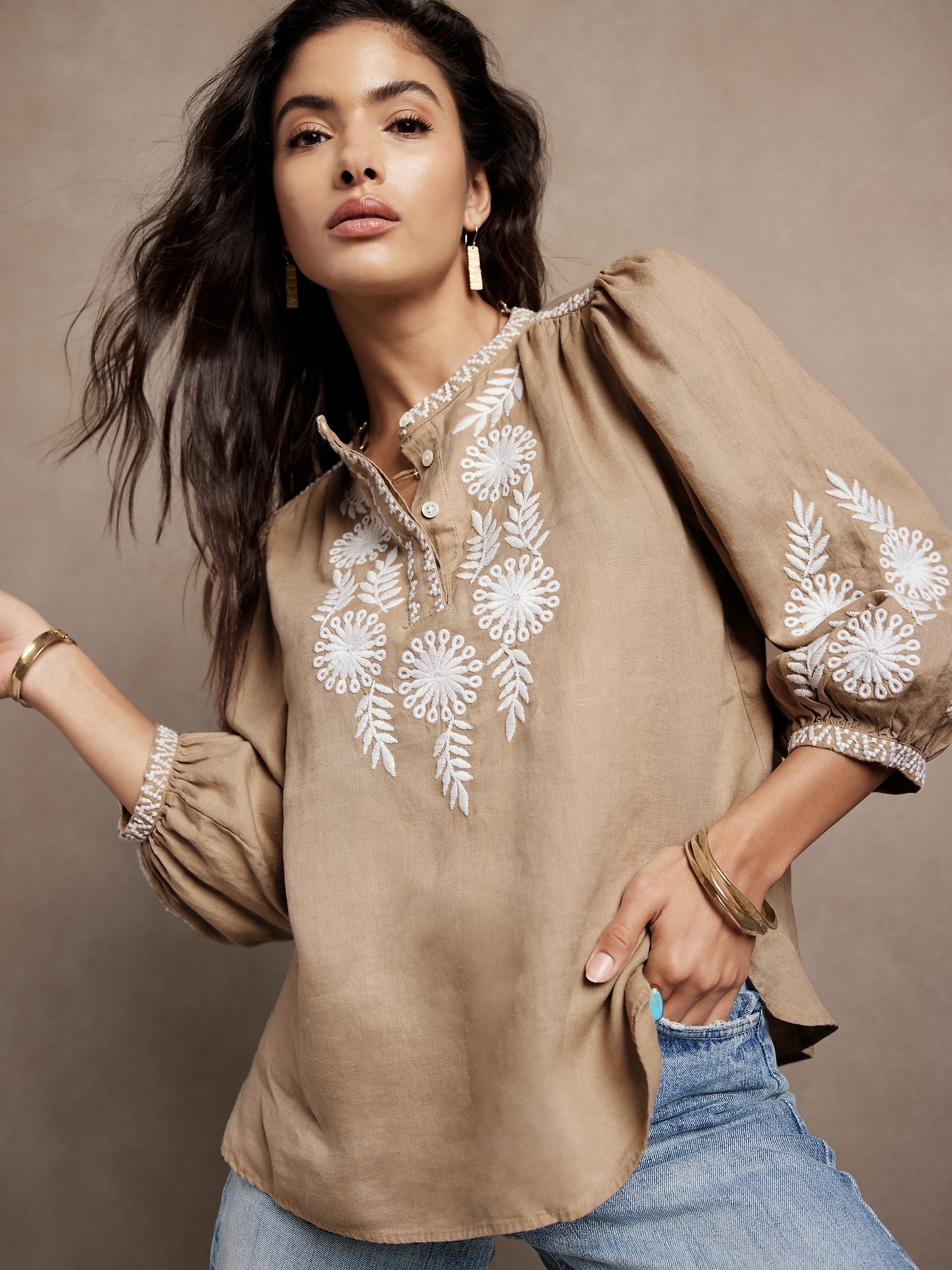 Few pieces cross oceans of time and remain classics. This worldly piece, however, found a way. Using luxurious linen and intricate embroidery, this lightweight silhouette stands the test of time with astonishing ease. RELAXED FIT: Expertly cut for a loose fit. Banded collar with hidden button placket. Shirring at the shoulders, back yoke and cuffs. Blouson sleeves. Curved hem with side slits. Relaxed fit. Elbow-length sleeve. Hip length. Body length (size S): Petite 25, Regular 26, Tall 27. 5 Sleeve length: Petite 26, Regular 27. 5, Tall 29 Model: Size S, 510 (178cm). Hand wash or dry clean.