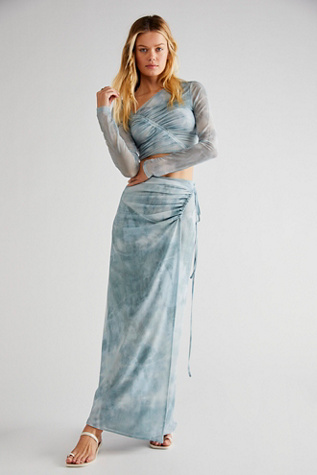 Turn heads in this so special set featuring a ruched crop top with asymmetric neckline and matching mid-rise wrap skirt both designed in a subtle tie dye mesh fabrication for ready-for-anything style from season to season*How To Style:* We recommend tying the top cinch strap around the back to the wearers left for the perfect wrap silhouette.