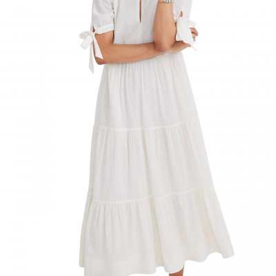 A dreamy dress of textural Swiss dot has sweet ties at the sleeves and a flirty keyhole neckline that you can wear open or buttoned up. Style Name: Madewell Tie Sleeve Tiered Swiss Dot Midi Dress. Style Number: 6036351. Available in stores.