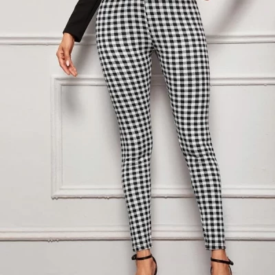 Style: Casual Color: Black and White Pattern Type: Gingham Pant Length: Long Pant Type: Skinny Season: Spring/Summer/Fall Composition: 95% Polyester, 5% Spandex Material: Polyester Fabric: Slight Stretch Sheer: No Fit Type: Skinny Waist Type: High Waist Closure Type: Elastic Waist