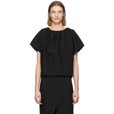 Short sleeve viscose-blend twill blouse in black. Gathering at crewneck collar. Concealed zip closure at back. Tonal hardware. Supplier color: Black
