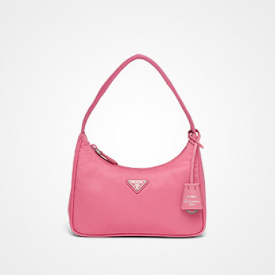 Practical and feminine, the nylon mini bag is decorated with iconic Saffiano leather trim. It features a contemporary mix of materials. Nylon, Saffiano leather Detachable Prada Re-edition 2000 Saffiano leather name tag with keychain Fabric shoulder strap Top zipper closure Prada logo nylon lining Enamel metal triangle logo 17 cm height 6 cm length 22 cm width