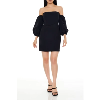 Woven mini dress featuring an off - the - shoulder neckline, princess seams, 3/4 puff sleeves, concealed zipper back closure, and fit and flare silhouette. | Shell: 100% nylon | Lining: 100% polyester | Hand wash cold | Model is 5'6" and wearing Small | Full length: 25.75" | Women's Off - the - Shoulder Mini Dress in Black, XS
