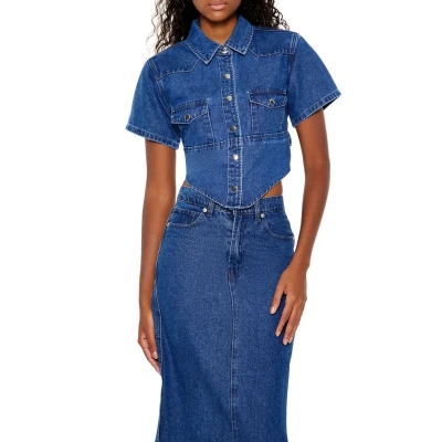 Crafted from stretch - denim, this shirt features a basic collar, chest flap pockets, snap - button front closures, short sleeves, a curved hem, back cutout with a self - tie closure, and a cropped hem. | 73% cotton, 18% rayon, 9% polyester | Machine wash cold | Model is 5'11" and wearing a Small | Women's Denim Tie - Back Cropped Shirt in Dark Denim Small