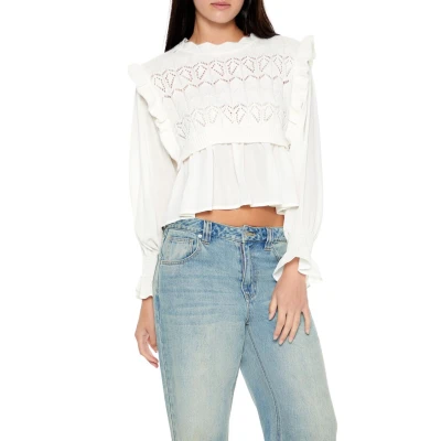Woven combo top featuring partial open - knit sweater construction, scalloped trim, round neckline, long trumpet sleeves, and cropped hem. | Shell 1 & 2: 100% polyester | Hand wash cold | Model is 5'9" and wearing Small | Women's Scalloped Sweater - Knit Combo Top in Cream, XS