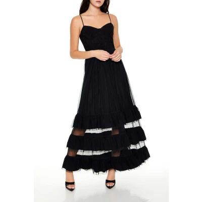Jacquard maxi dress featuring partial floral pattern construction, sweetheart neckline, adjustable cami straps, straight - cut back with concealed zipper closure, sheer overlay with tiered design, and column silhouette. | This is an independent brand and not Forever 21 branded item. | Shell 1 & Other contents: 100% polyester | Shell 2: 96% polyester, 4% spandex | Hand wash cold | Model is 5'9" and wearing Small | Women's Tiered Jacquard Floral Maxi Dress in Black Large
