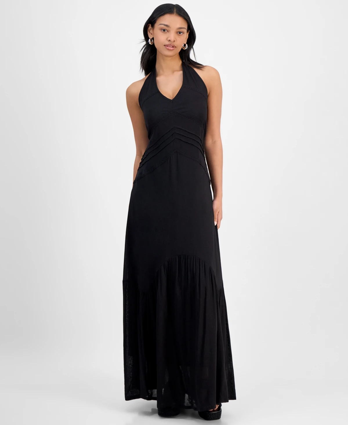 A sweeping maxi dress from And Now This looks lovely with the addition of a halter neckline, lace trim and delicate pintucked pleats.