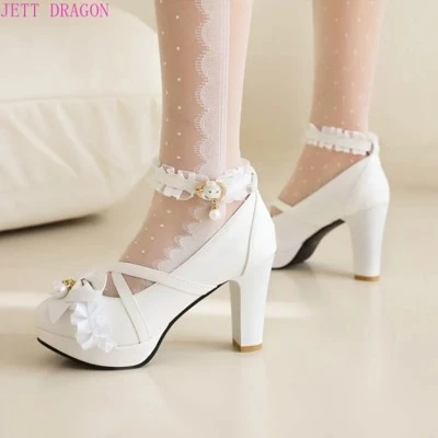 New Sweet Bow High Heels Women's Chunky Heels Ruffled Mary Jane Ladie Pumps Party Wedding White Pink Black Girls Lolita Shoes - AliExpress