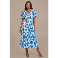 Blue Floral Short Sleeve V Neck Smocked Midi Dress