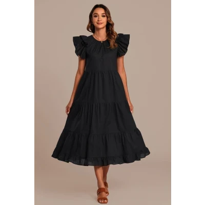 Black Ruffle Shoulder Round Neck Tiered Midi Dress