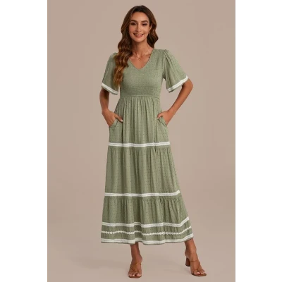 Olive V Neck Short Sleeve Swiss Dots Smocked Tiered Midi Dress